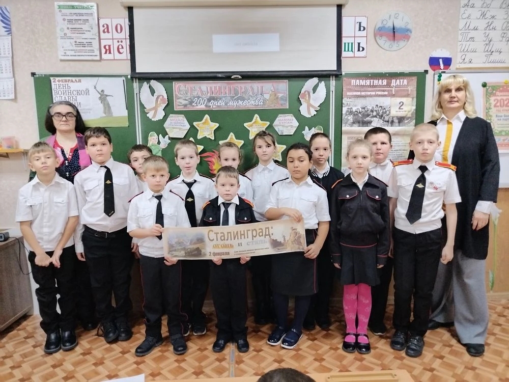 Как проходила Сталинградская битва и в чём её значение — обо всём этом ребята узнали, из рассказа библиотекаря рассказано о великом подвиге защитников Сталинграда: о защитниках «Дома Павлова», которые держали оборону почти 2 месяца и не дали врагу захватить его; о «главной высоте Отчизны», где шли самые ожесточенные бои, Мамаевом кургане, каждый квадратный метр которого был пробит тысячью осколков мин и снарядов.