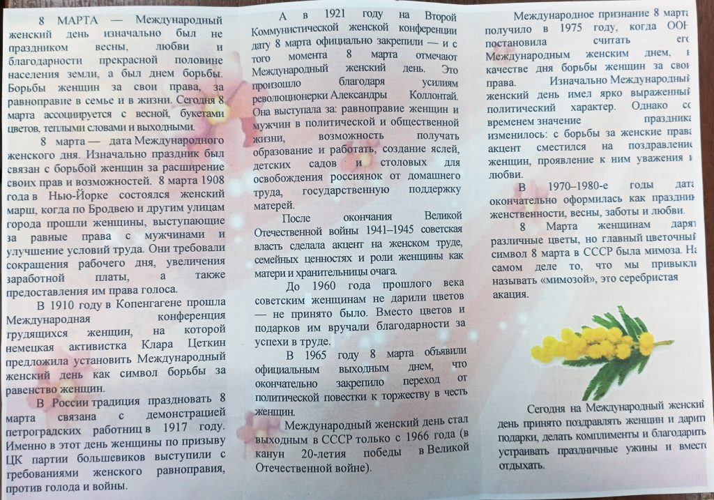 06 марта Сергиевская сельская библиотека хутора Нижнего совместно с сельским Клубом провела праздничное мероприятие посвящённое Международному женскому дню, «Живи и радуй нас, дорогая мама» .Библиотекарь рассказала о истории праздника, вспомнили и пропели песни и стихи о маме. Затем ребята своими руками сделали маме подарок (декупаж емкости для специй)