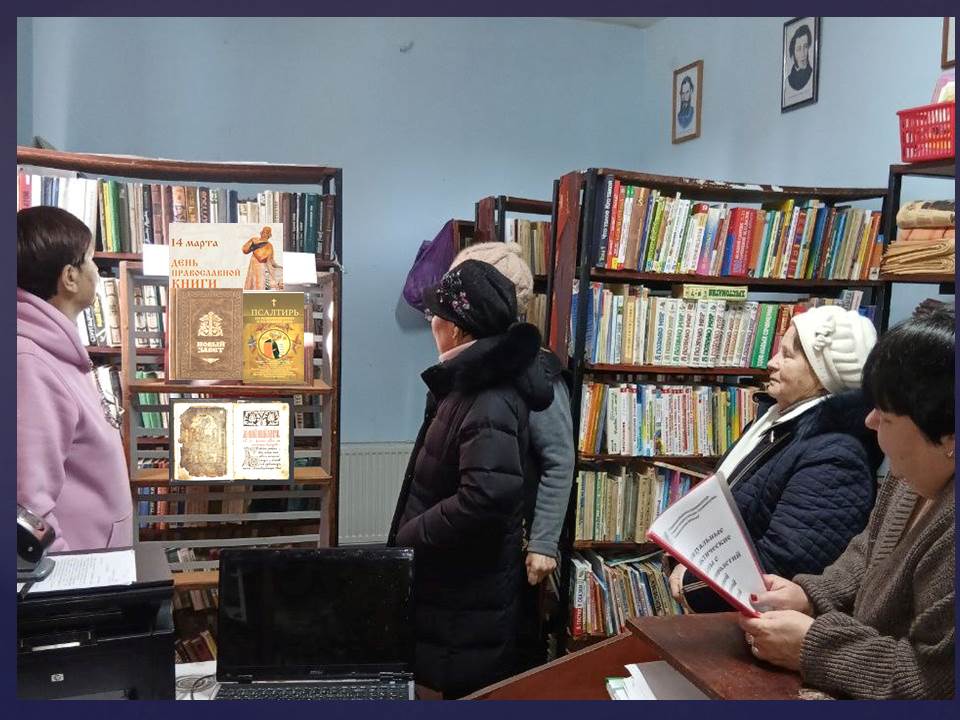 В сельской библиотеке хутора Нижнего,  библиотекарь провела обзор у книжной выставки  «Живое слово мудрости , посвященная Дню православной книги.  В ходе познавательной беседы гости ознакомились с создателями славянской азбуки – святыми равноапостольными Кириллом и Мефодием. Узнали, как создавали и писали книги на глиняных табличках, папирусе, бересте, деревянных дощечках, пергаменте.