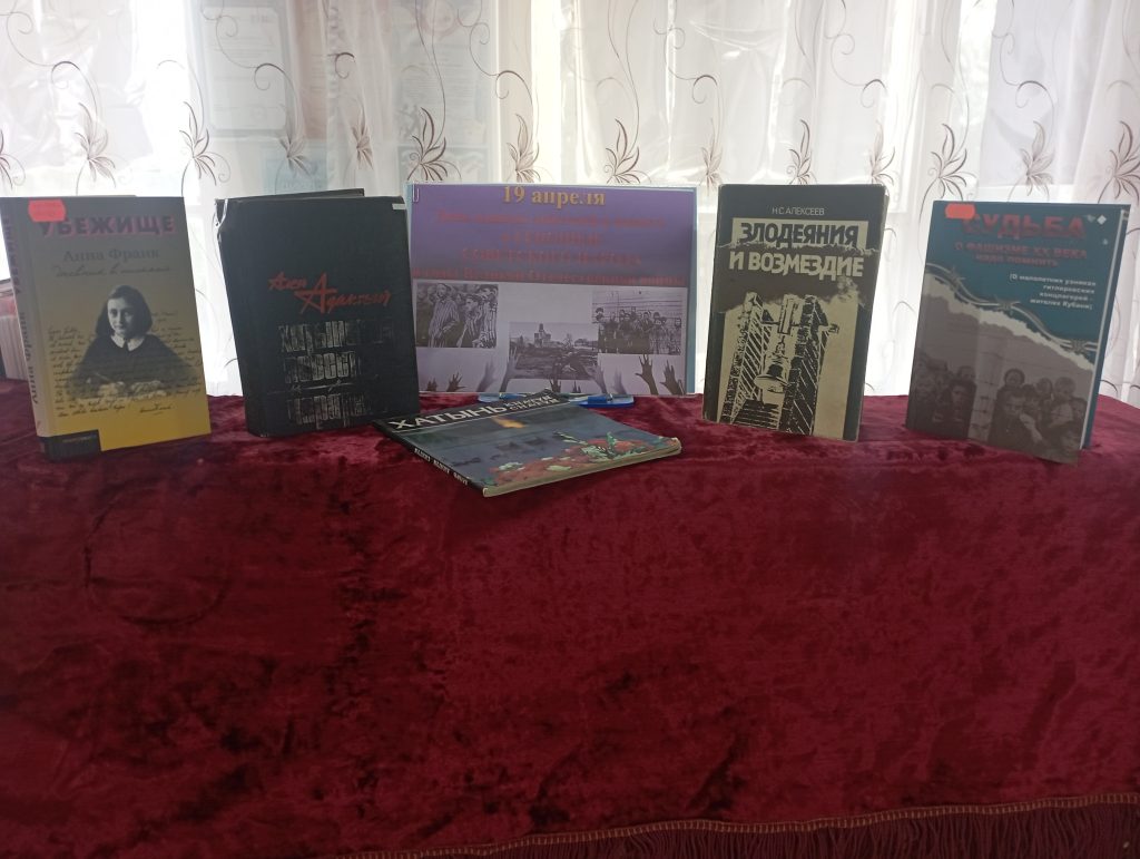 Эта  памятная дата, посвященная всероссийскому Дню единых действий в память о геноциде советского народа нацистами и их пособниками в годы Великой Отечественной войны. К этой дате в читальном зале библиотеки оформлена книжная выставка «19 апреля День единых действий в память о геноциде советского народа в годы Великой Отечественной войне». На выставке представлены книги из фонда библиотеки, где рассказывается о зверствах фашистов и их пособников в отношении мирных советских граждан в годы Великой Отечественной войны.